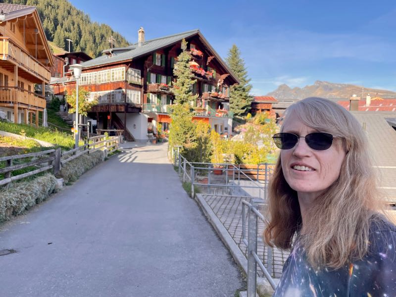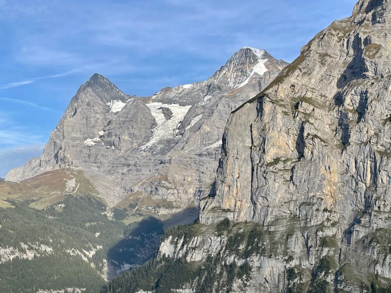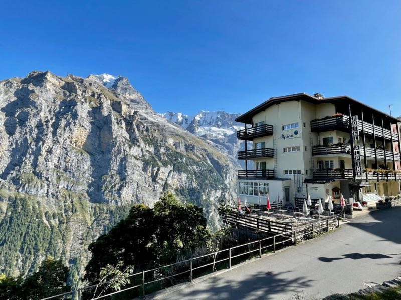 Their home base was the little village of Murren, located partway up the Schilthorn Mountain. They stayed at the Hotel Alpina, where the accommodations were comfortable and clean, and their hosts were very welcoming. The hotel was positioned a little less than halfway up the mountainside on the edge overlooking the Jungfrau range, including the famous Eiger.