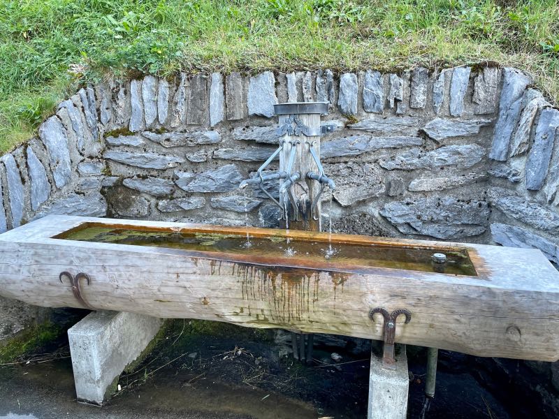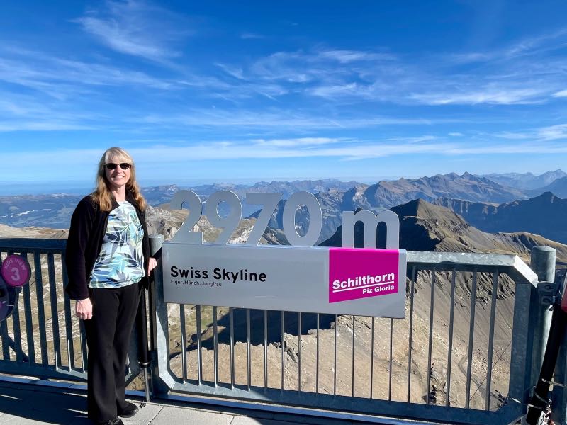 They filled their water bottles at the spring, which bubbled from the mountain across from the hotel, before beginning the next leg of the day's adventure: a cable car ride to the top of the Schilthorn mountain for breathtaking views at 10,000+ feet of altitude. There was little snow as the region was in a bit of a long summer, and the temperatures at the top were surprisingly moderate. Monique seemed to overcome her fear of heights during this leg of the trip. They took in the views and were in awe of the vastness of the surrounding mountains.