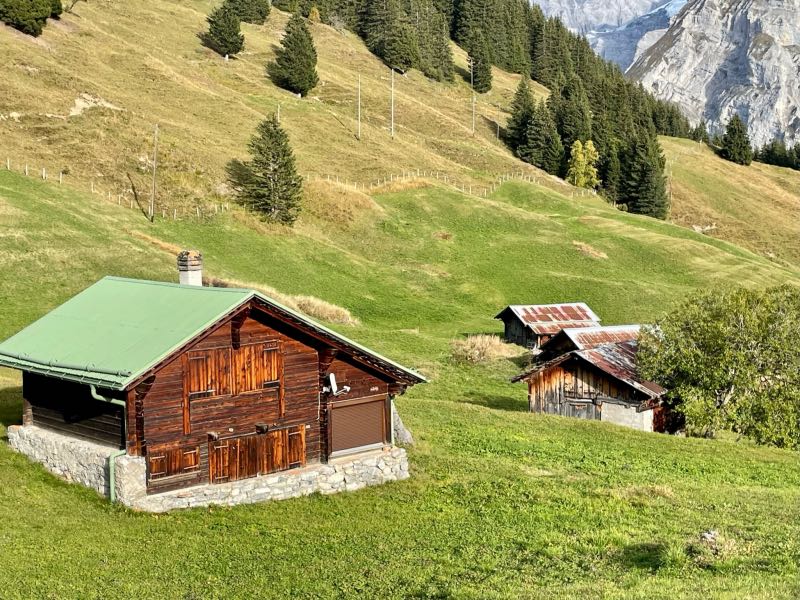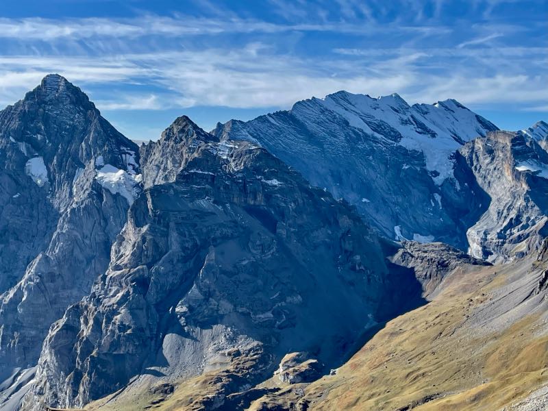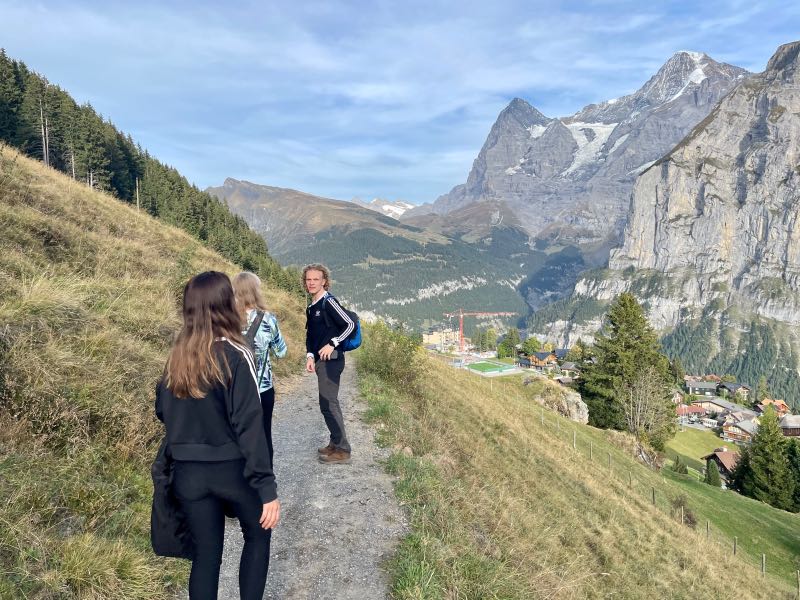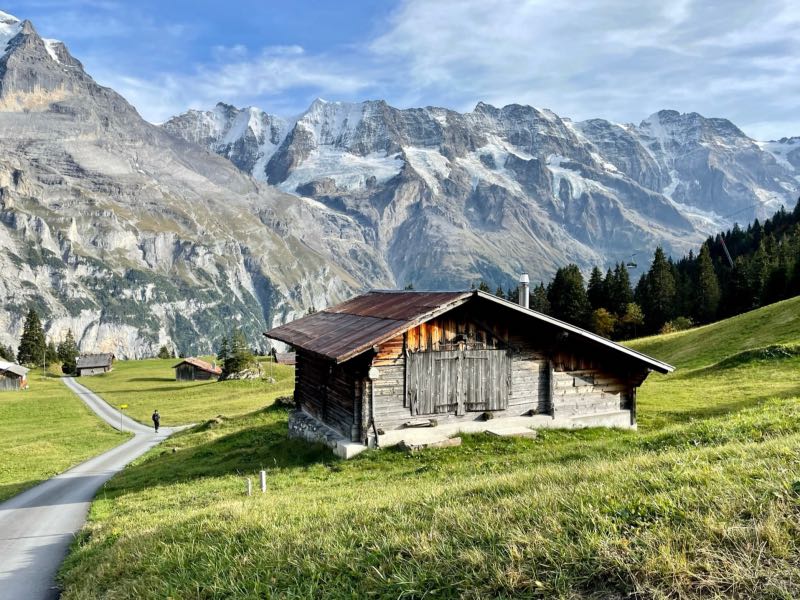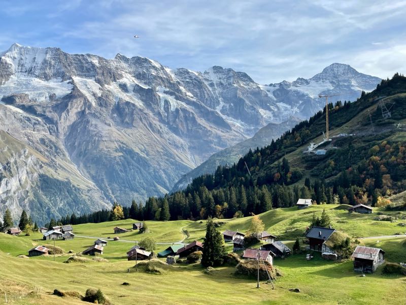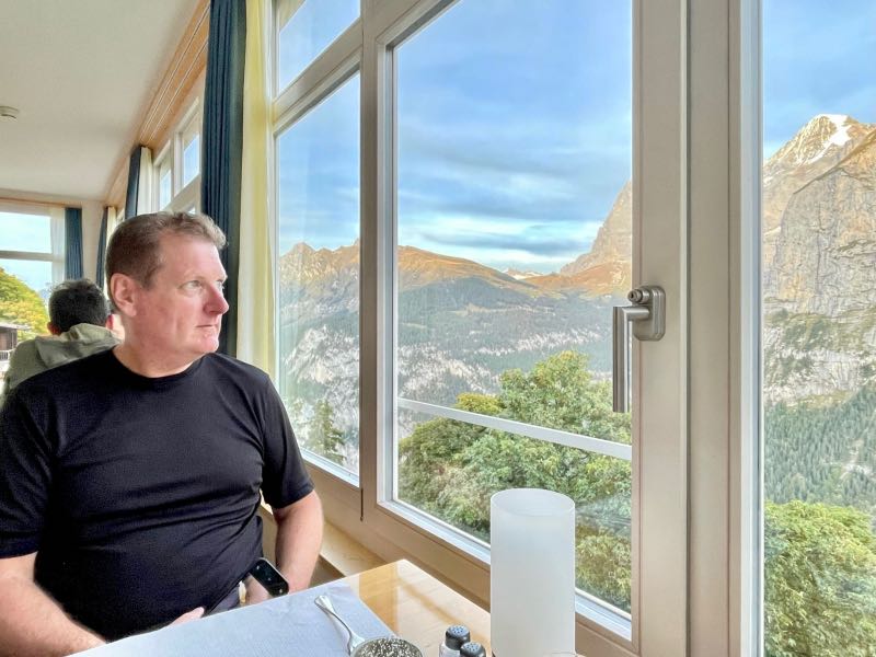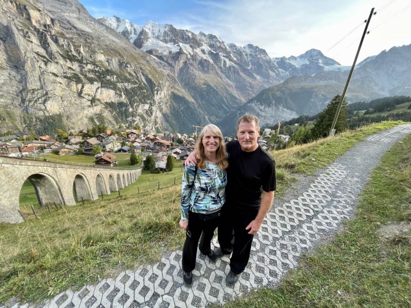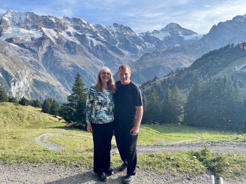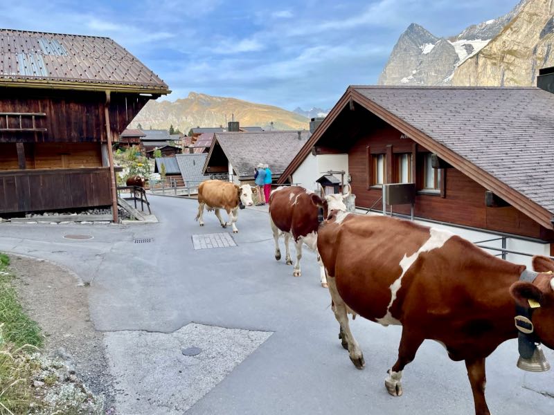 Much to the pleasant surprise of Tim and Monique, the young couple showed up at their hotel just as they were refilling their water bottles and getting ready for the second hike of the day. All four spent the rest of the day together hiking along the mountainside above Murren and discovered the small village of Allmendhubel after taking the funicular partway up the mountainside. Their time together made the day that much more special. They would stay in touch after their respective trips were over and would try to reconnect in the future in Oregon, Montreal, or some other exotic place. After Tim and Monique walked the couple to the cable car, they were treated to an end-of-the-day cow parade that would happen right down the middle of the street in the town of Murren on this day. Dinner was exceptional as usual, and the views from their hotel dining room were just as breathtaking as the first day. But wait, it gets even better...