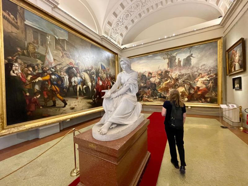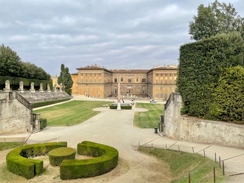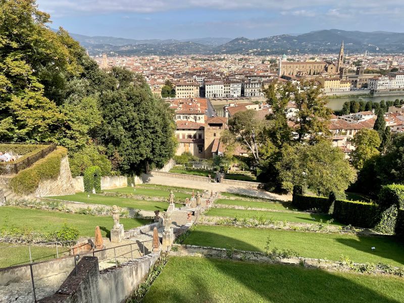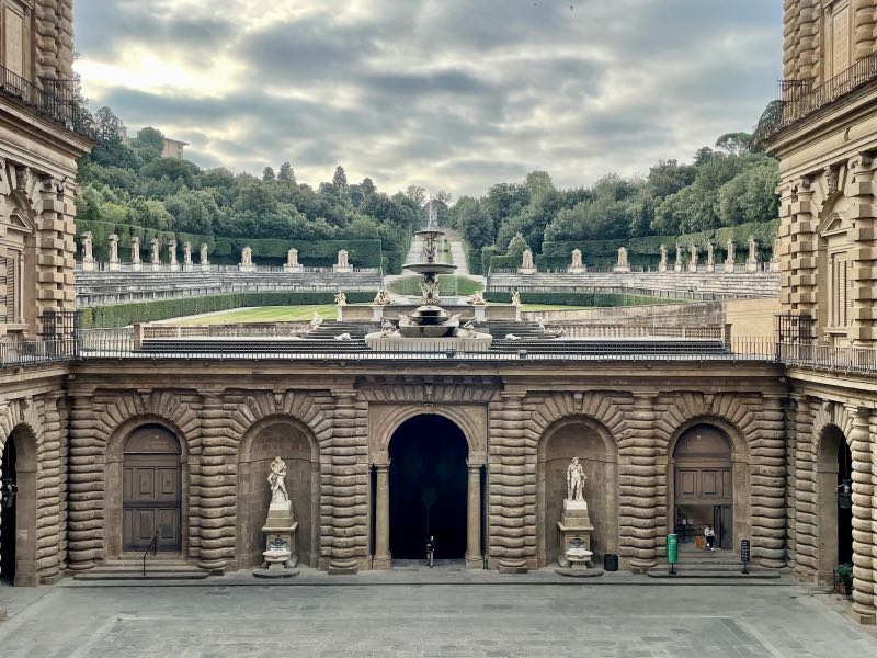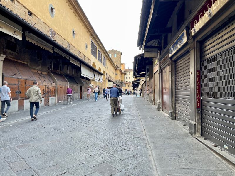 Their accommodations, which were less than two blocks from the Ponte Vecchio, came with a complimentary breakfast each day courtesy of Casa Uffizi that consisted of an espresso or a cappuccino and a breakfast crescent or pastry. It seemed simple, but it is often the simplest pleasures that can start the day off right. It is a well-known fact that Tim and Monique do not drink coffee. However, Italian coffees have much more flavor, and Tim enjoyed his morning cup every day in Florence, while Monique tolerated hers. The plaza was in front of the Palazzo Vecchio. After a short stroll across the Ponte Vecchio and along the Arno River, the travelers spent the first half of the day going through the Pitti Palace, which had no line to get in like other museums, little foot traffic, and an incredible display of statues, artwork, and painted ceilings. At the end of the palace tour, they enjoyed a long explorative walk through the attached Boboli garden, which was the size of a small village. Tim and Monique then followed a tip by one of the museum employees and hiked across town and up to the top of the hill, where they discovered a gem of a somewhat hidden spot, the Bardini Garden, with 180-degree views of the entire city. Upon exiting this hilltop garden, they stumbled across the Piazzale Michelangelo, which housed a bronze replica of the statue of David. This was as close as the two would get to the real statue, as neither one felt the need to wait in line or join a crowd of people to see the actual statue. This theme was followed the entire trip, and it worked well. They would clean up a bit for dinner and then enjoy their first pizza in Italy on this trip. It would not be the last. The day ended with a short walk around the city to take in the night culture of Florence, where you could feel the history in every direction.